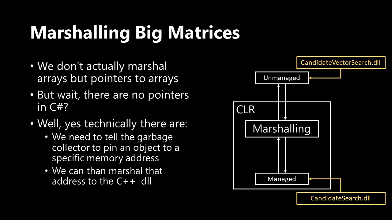 What I really needed to solve though was the interoperability between C++ and C#: In .NET that process is called marshalling. Specifically, what I needed to do is to get my matrix from my C# program to my C++ program and then the result back. It is possible to marshal custom data structures but it is much easier to stick to commonly available data types. So basically arrays.