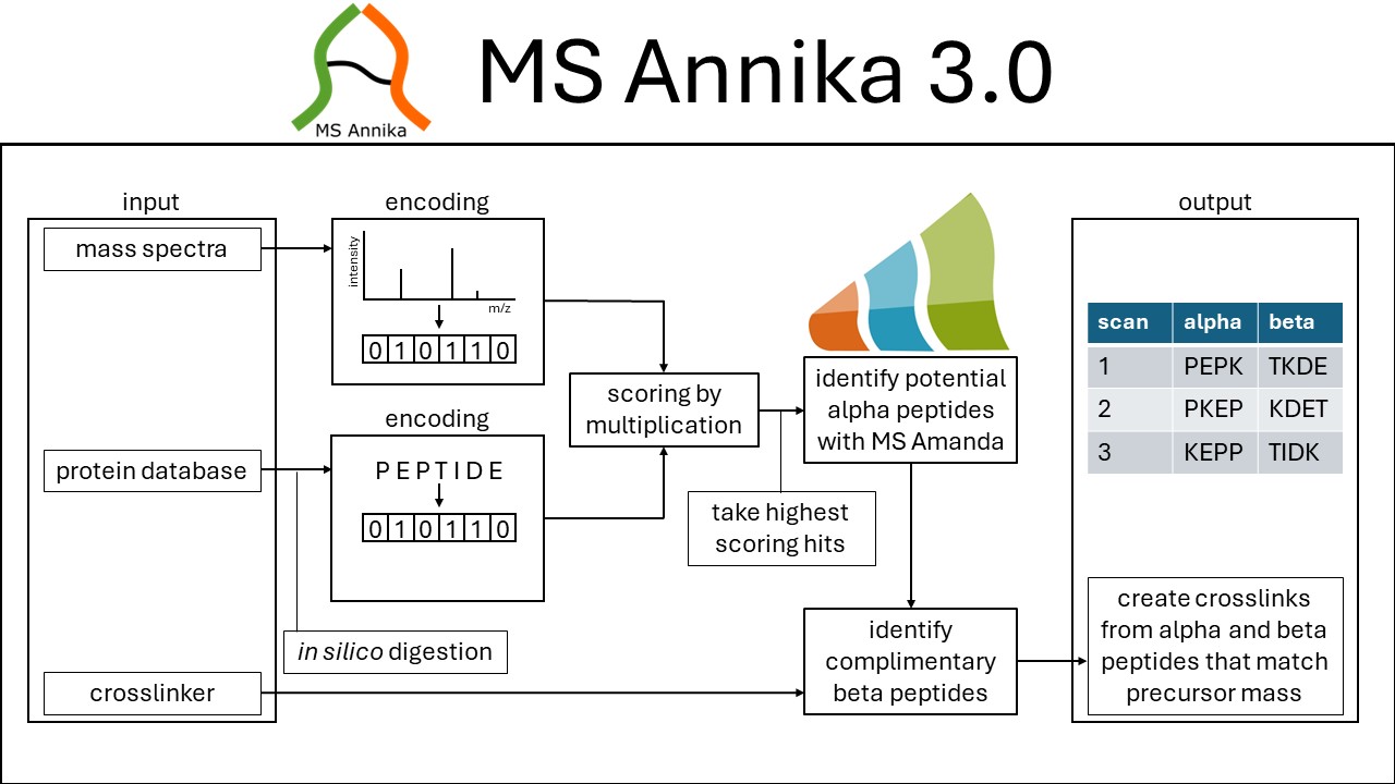 Explanation (as taken from the pre-print): Schematic overview of the algorithm for identification of non-cleavable crosslinks in the search engine MS Annika. Mass spectra and peptides arising from the in silico digestion of the protein database are encoded as sparse vectors and subsequently scored by matrix multiplication. The highest scoring hits are considered for the identification of potential alpha peptides with the peptide search engine MS Amanda. Identified alpha peptides are used to find complimentary beta peptides and ultimately alpha and beta peptides matching the mass spectrum's precursor mass are combined to crosslinks.