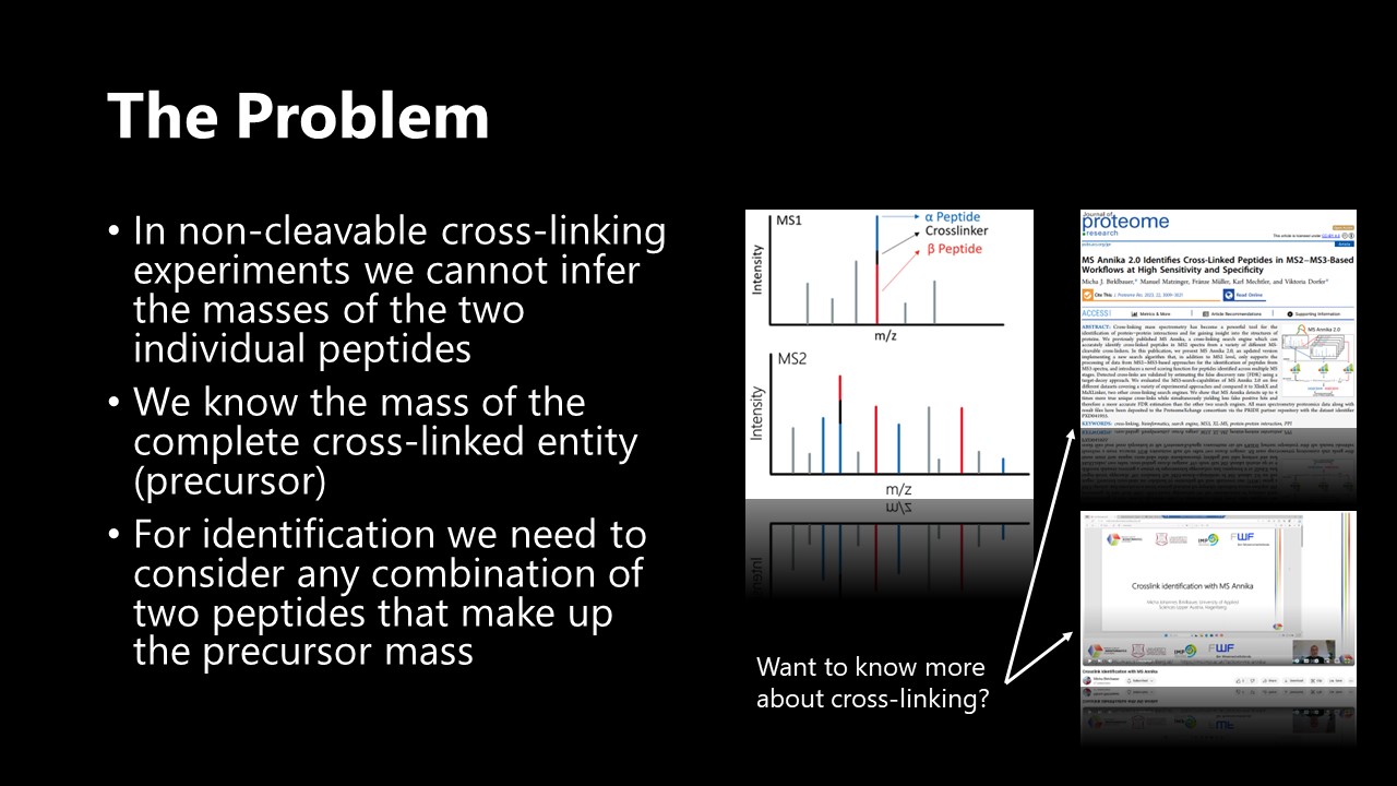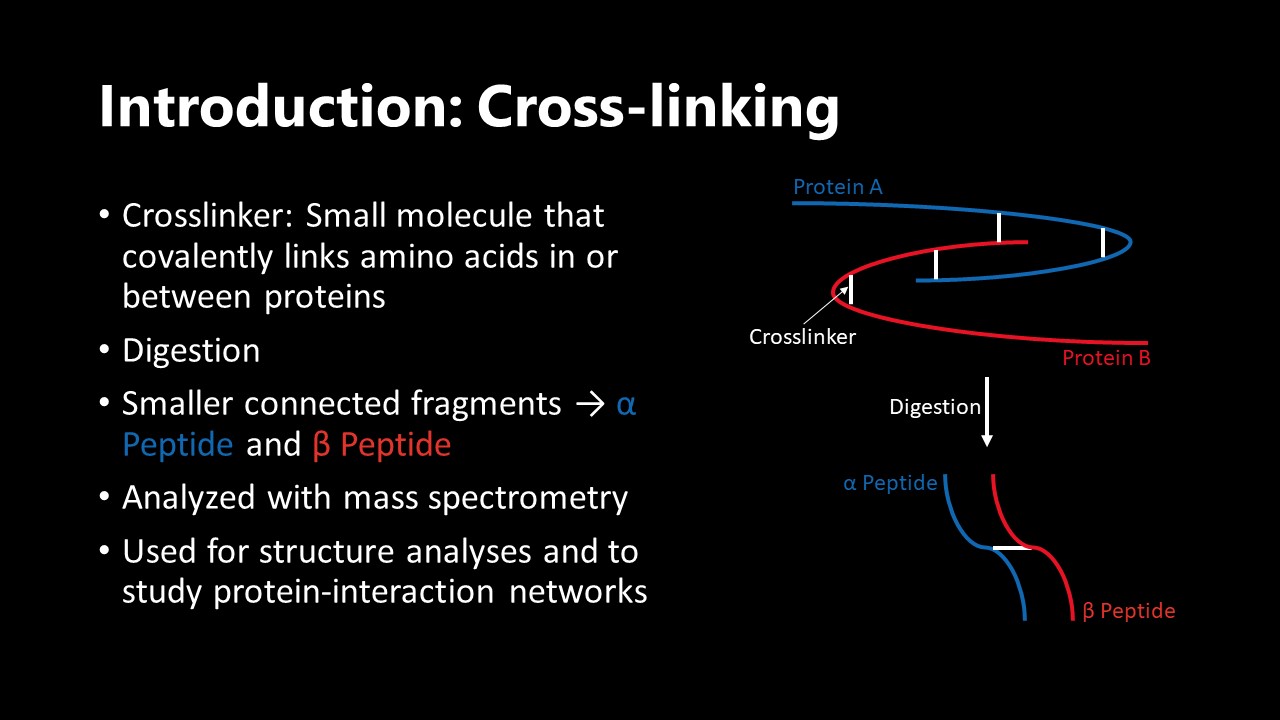 In classical bottom-up mass spectrometry-based proteomics we usually know the mass of the particular peptide that we look for in a mass spectrum. This drastically simplifies the identification process as we only have to consider peptides with a similar mass from our database. Contrary, in cross-linking - or more specifically - in non-cleavable cross-linking, which uses a distinct kind of cross-linking reagent, we only know the mass of the whole cross-linked entity but not the mass of the individual peptides.