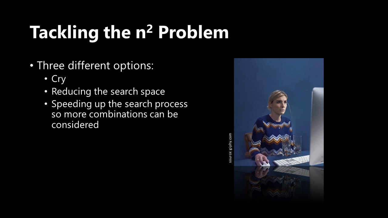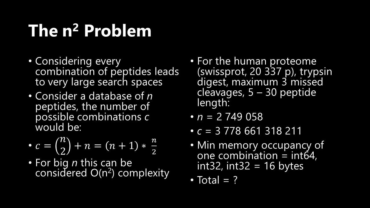Approaching problems like this always starts with going through the five stages of grief and crying is probably just part of doing a PhD. Anyway, after you reach acceptance it's time to stop breaking down and start breaking down the problem and searching for solutions. It was very obvious that in this case the "solution" would be, on the one hand to limit the number of combinations, and on the other hand to implement a very fast search algorithm that can deal with a high number of combinations. Both of these things are easier said than done, after all there is a reason why this challenge has still mostly remained unaddressed after all these years of non-cleavable cross-linking - which is also why non-cleavable cross-linking has been limited to small scale experiments.