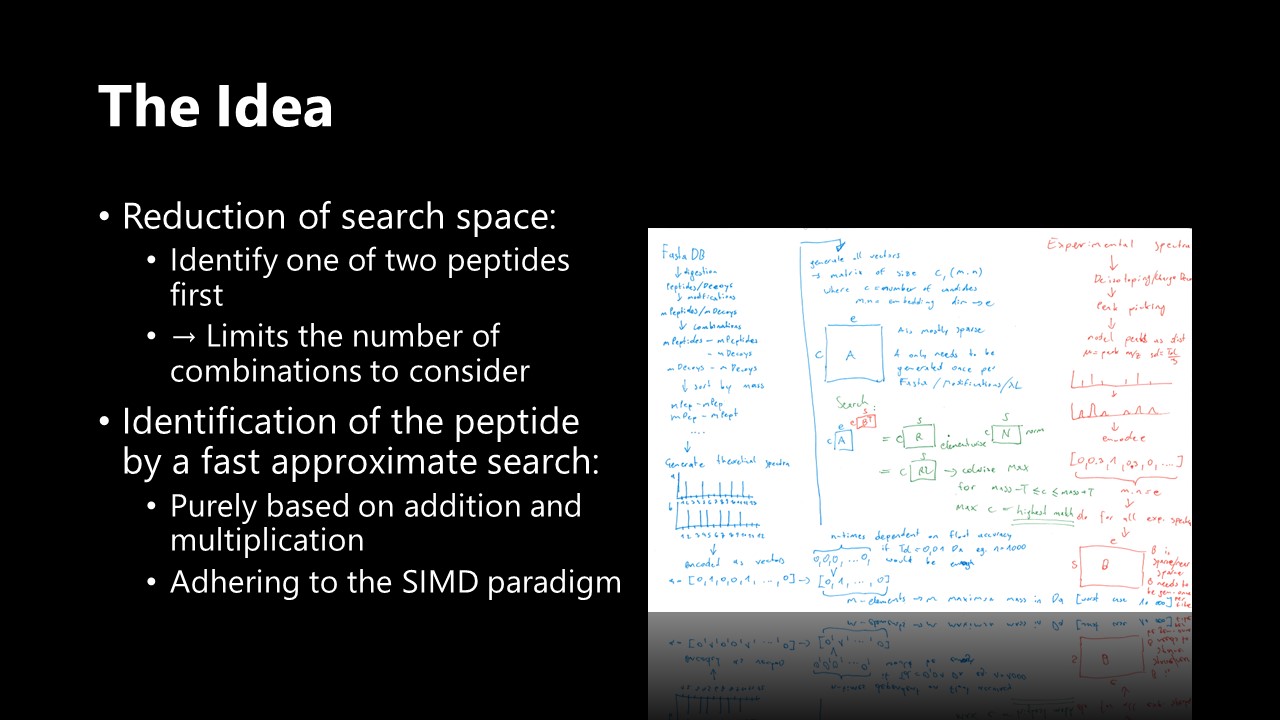 Like all ideas this one also started on paper, you can see the first draft below! The core idea of the algorithm is still the same today, even though many parts changed from its inception to the final implementation that is now incorporated in MS Annika 3.0 - the crosslink search engine I am developing. I'll go over the final implementation of the algorithm towards the end of this blog post, but for now I want to focus on the journey of how I got there!