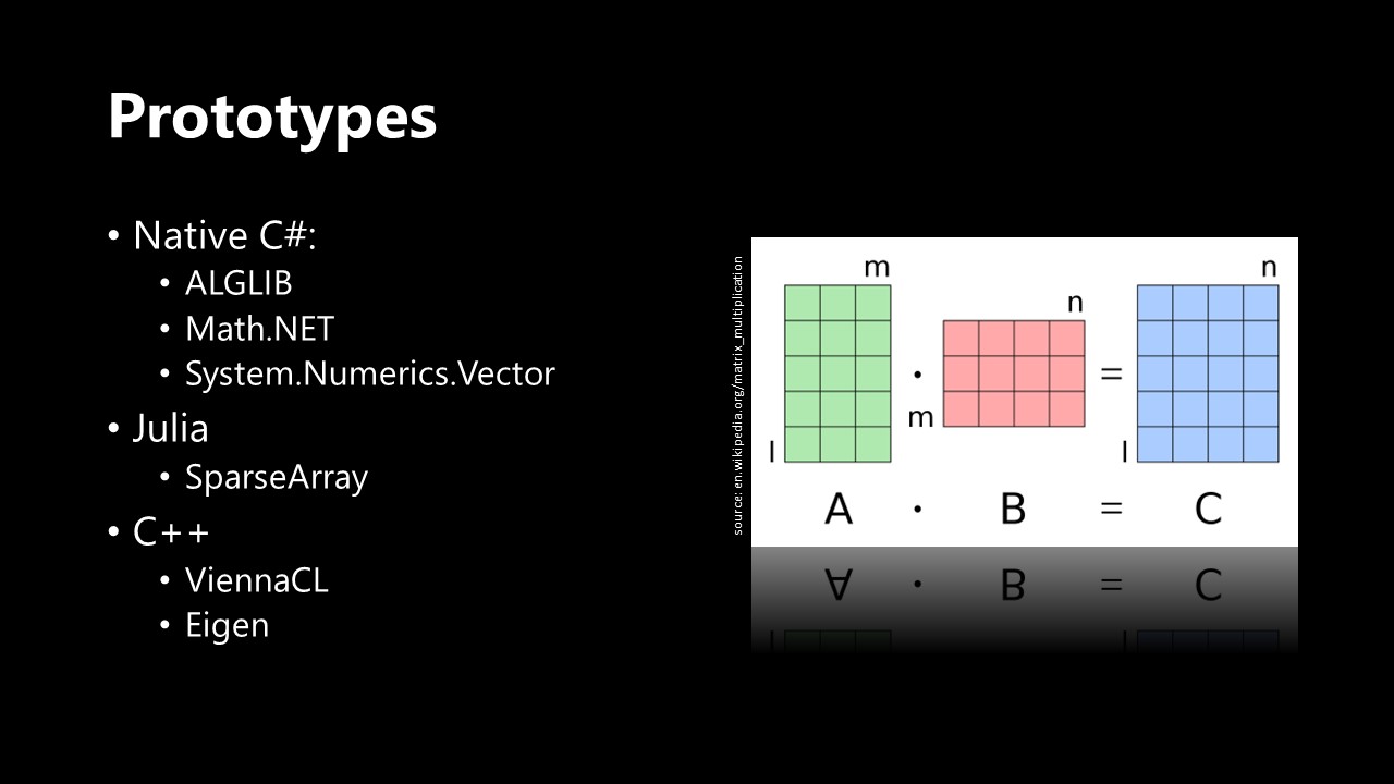 - Use a C# native matrix multiplication: Easy to implement and easy to interface with the already available MS Annika code, but probably at the cost of performance