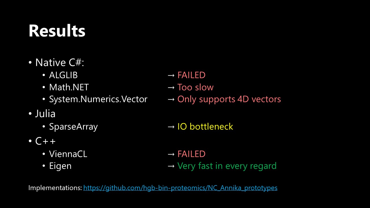 Let's start off with the C# native implementations, the first thing I tested was a numeric algebra library called Math.NET: Now Math.NET was quite straightforward to use, supported sparse matrices out of the box and was very easy to integrate into the existing MS Annika code. For smaller matrices it also performed decently well, however - as already mentioned - small matrices were not a comfort we were allowed to have. The goal was to solve problems consisting of matrices that were very large and for that Math.NET unfortunately was way to slow. The identification process using a simulated human proteome database and one single simulated mass spectrum would take more than 40 seconds, which is way too long considering that studies of that scale usually feature several hundred thousand mass spectra.